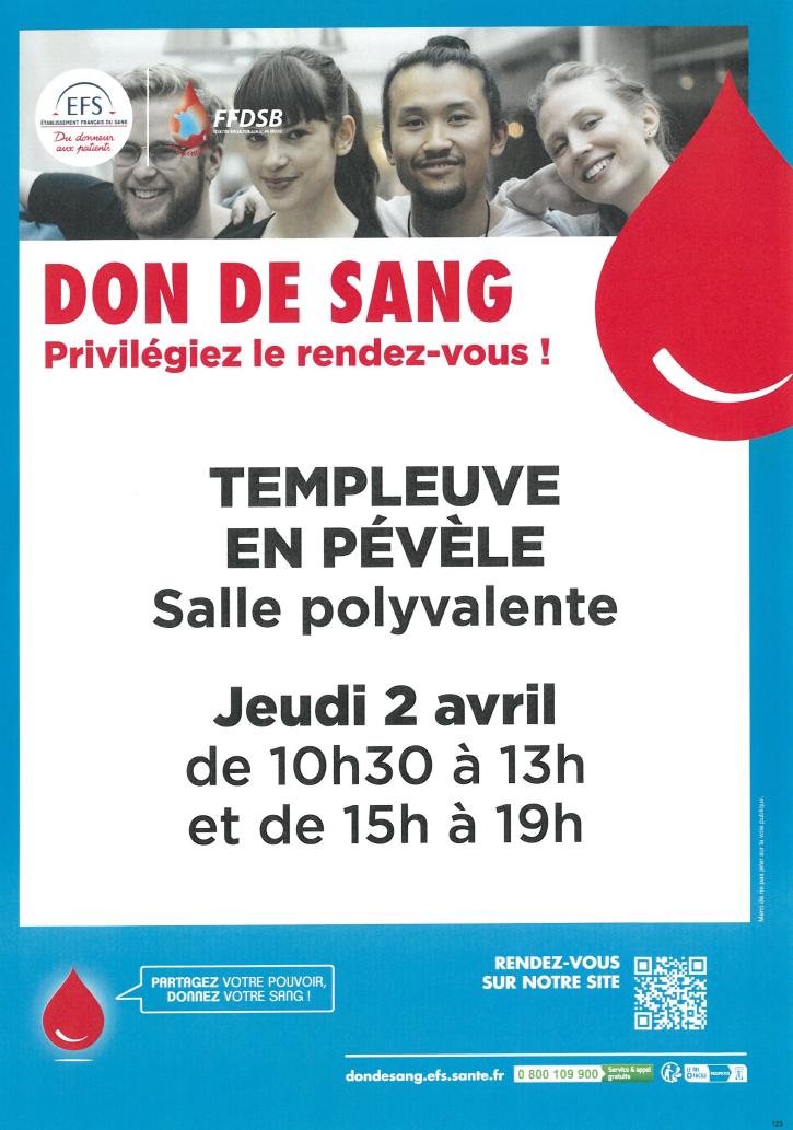 La prochaine collecte aura lieu le jeudi 2 avril de 10h30 à 13h et de 15h à 19h à la salle polyvalente de Templeuve-en-Pévèle (rue de Roubaix).