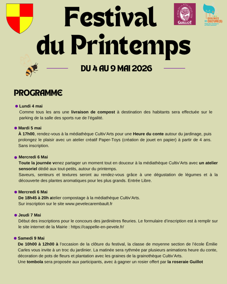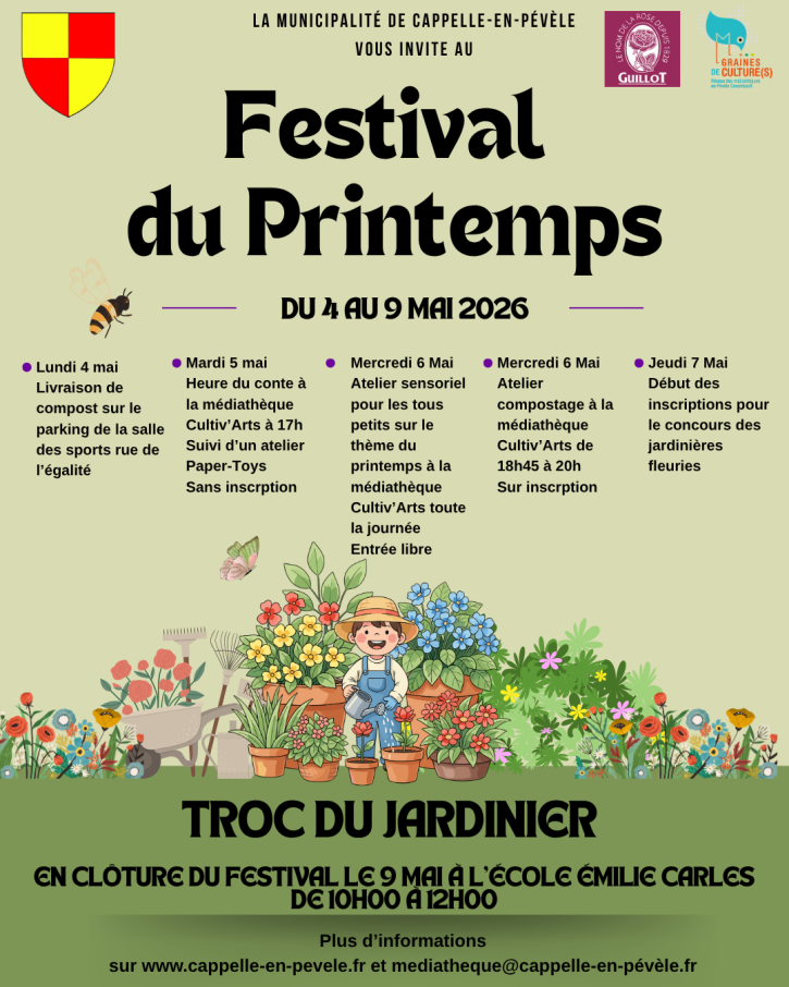 - Samedi 9 mai clôture du festival de 10h à 12h à l’école avec un Troc du jardinier, accompagné de nombreuses animations : heure du conte, décoration de pots de fleurs et plantation de graines issues de la grainothèque de la médiathèque Cultiv’Arts.