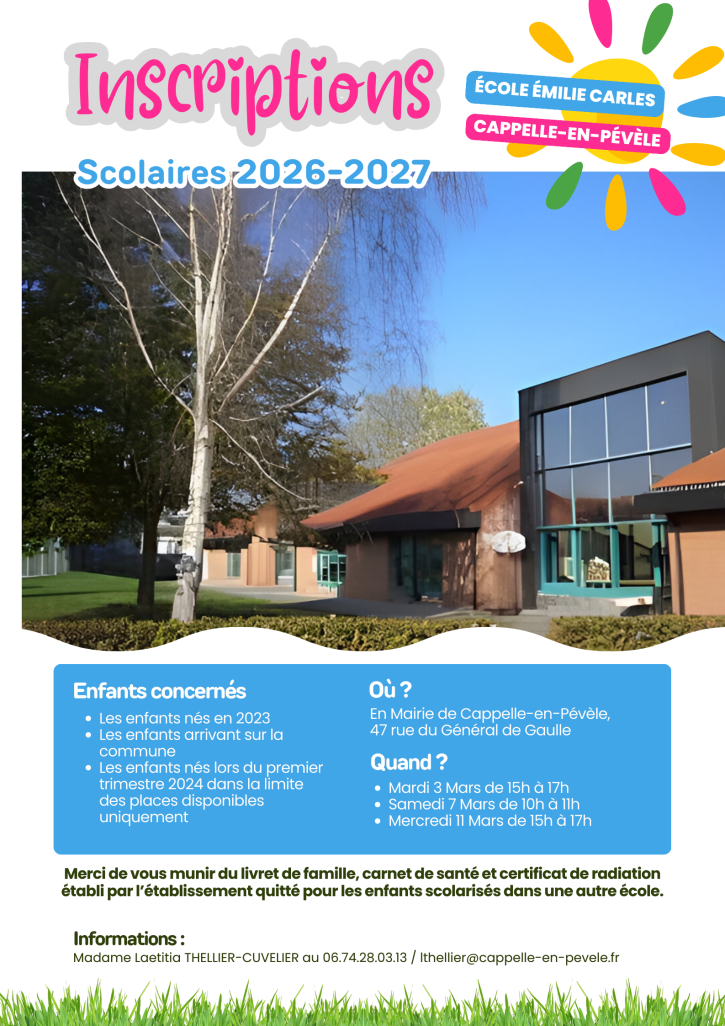 Cette année, les inscriptions des enfants nés en 2023 et des nouveaux enfants Cappellois auront lieu en mairie le :