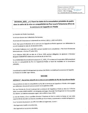 Décision fixant les dates de la concertation préalable du public dans le cadre de la mise en compatibilité du Plan Local d'Urbanisme de la commune de Cappelle-en-Pévèle
