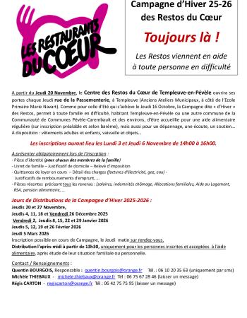 Inscriptions pour la Campagne d’Hiver au Centre de Templeuve-en-Pévèle (anciens ateliers municipaux rue de la Passementerie) le 3 et 6 novembre, de 14h à 16h.