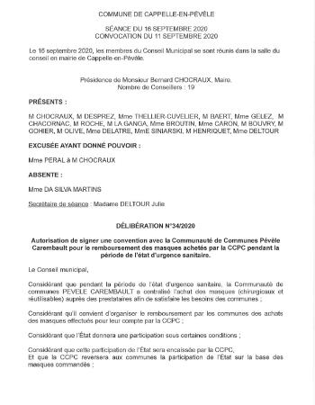 Autorisation de signer une convention avec la Communauté de Communes Pévèle Carembault pour le remboursement des masques achetés par la CCPC pendant la période de l'état d'urgence sanitaire