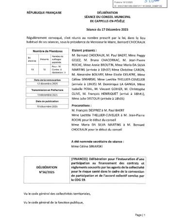 [FINANCES] Délibération pour l’instauration d’une participation au financement des contrats et règlements souscrits par les agents de la collectivité pour le risque santé dans le cadre de la convention de participation et de l’accord collectif conclus par le CDG 59