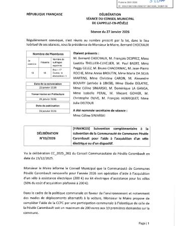 [FINANCES] Subvention complémentaire à la subvention de la Communauté de Communes Pévèle Carembault pour l'aide à l'acquisition d'un vélo électrique ou d’un dispositif