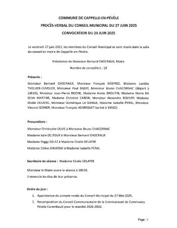 Retrouvez le procès-verbal et l'ensemble des délibérations de la séance du 27 juin 2025.