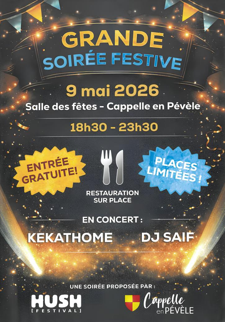 Grande soirée festive le samedi 9 mai à la salle des fêtes, l'occasion de passer une bonne soirée musicale et de découvrir les artistes du territoire originaire de Cappelle-en-Pévèle, KEKaThOMe et DJ SAIF... en toute convivialité.