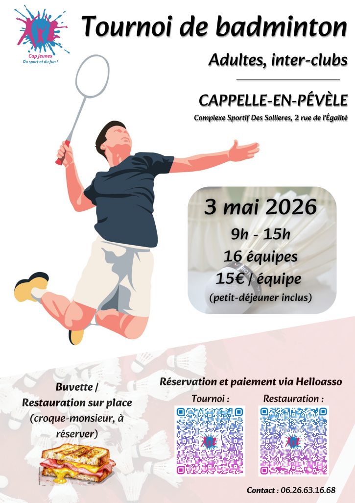 Un tournoi de badminton inter-clubs pour adultes aura lieu le 3 mai 2026 de 9h à 15h à Cappelle-en-Pévèle. Limité à 16 équipes, l’inscription est de 15 € par équipe avec petit-déjeuner inclus. Une buvette et une restauration seront proposées sur place.