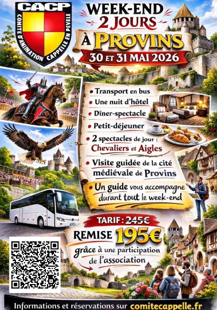 Les 30 et 31 mai 2026, profitez d’un séjour organisé par le Comité d'Animation de Cappelle en Pévèle comprenant le transport en bus, une nuit d’hôtel, un dîner-spectacle, le petit-déjeuner ainsi que deux spectacles incontournables : les Chevaliers et les Aigles.