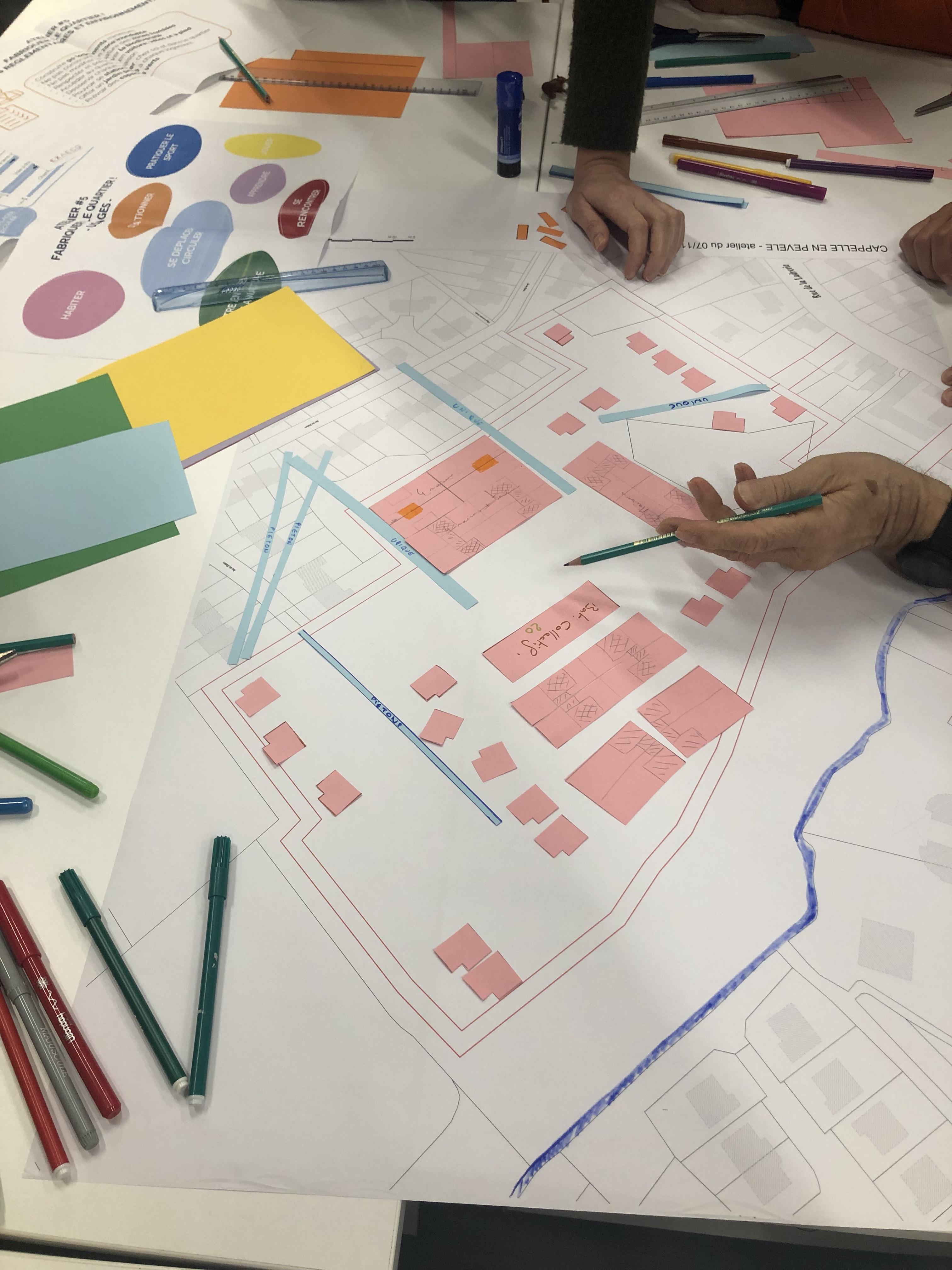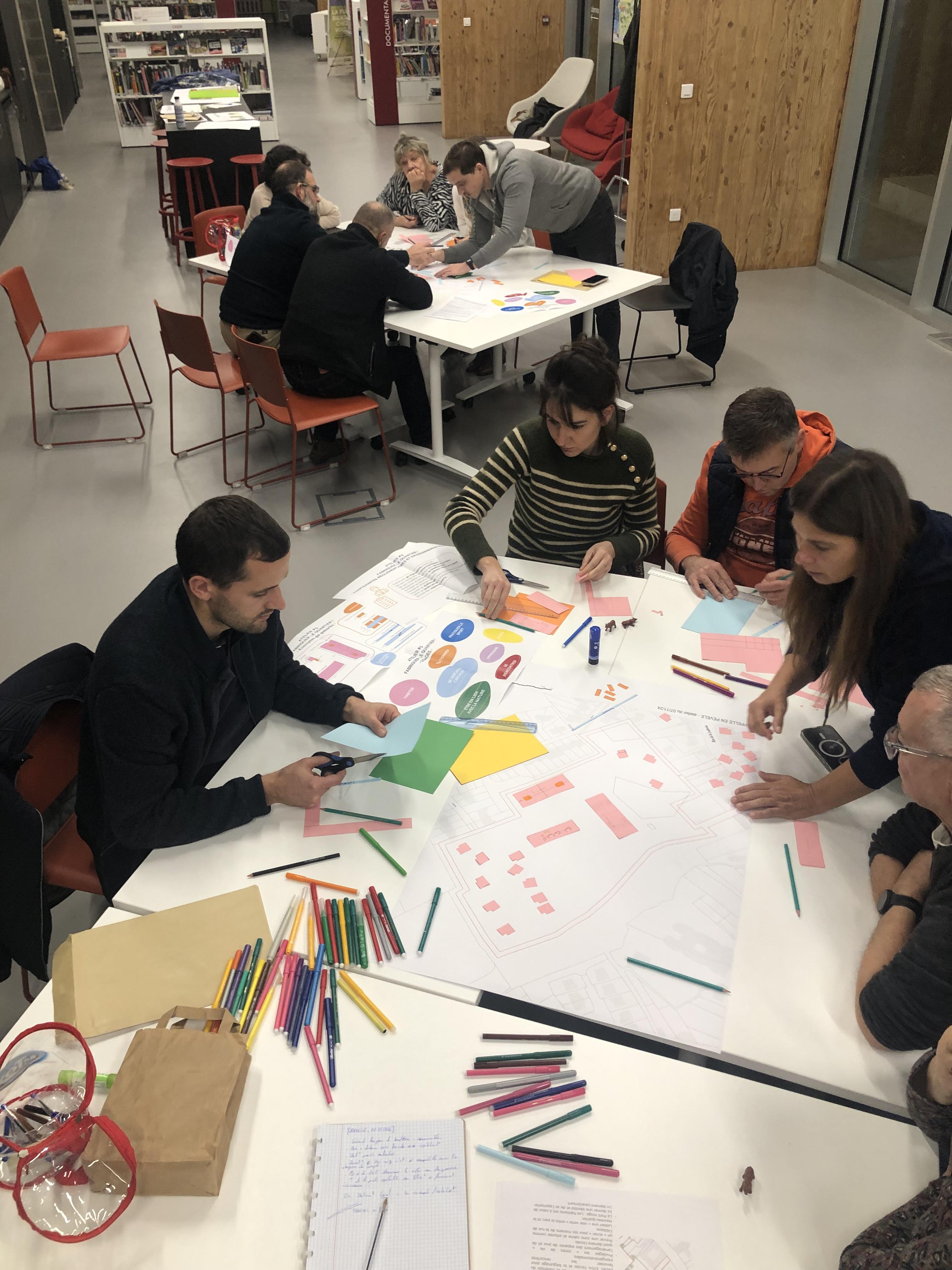 Ce sont 11 habitants et habitantes qui se sont réuni(es) pour le 5e et dernier atelier de concertation autour du nouveau quartier. Pour ce dernier temps d'échanges et de convivialité, les participant(es) se sont familiarisé(es) avec les différents usages et les contraintes de la "fabrique de la ville" en manipulant et positionnant des gabarits en plan et en coupe.